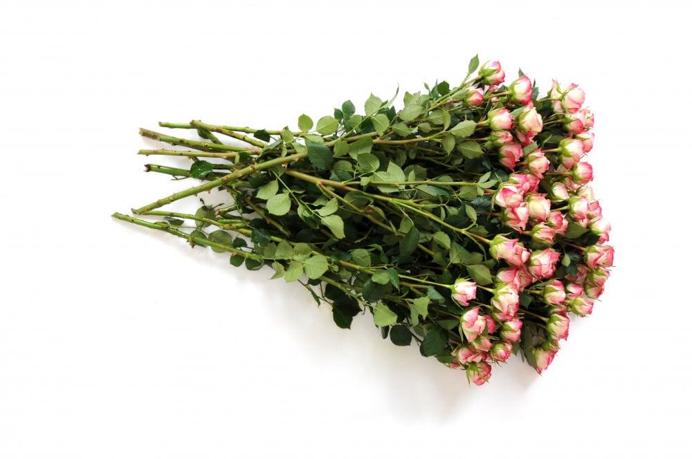 - ورود نضرة مع أغصان مُورِقة خضراء.